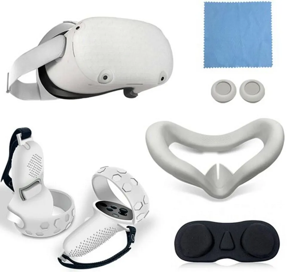 В набор входит: салфетка из микрофибры, 2 накладки для очков, силиконовый чехол для Oculus Quest 2, чехлы для контроллеров 2 шт, накладки на стики 2 шт.