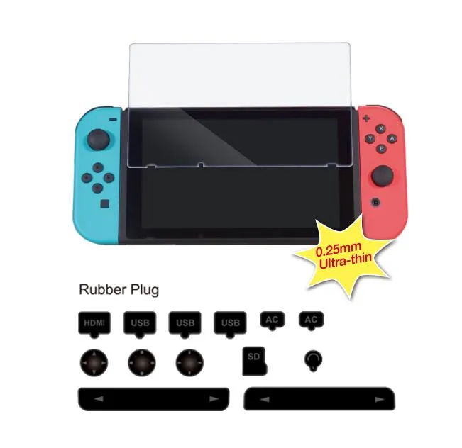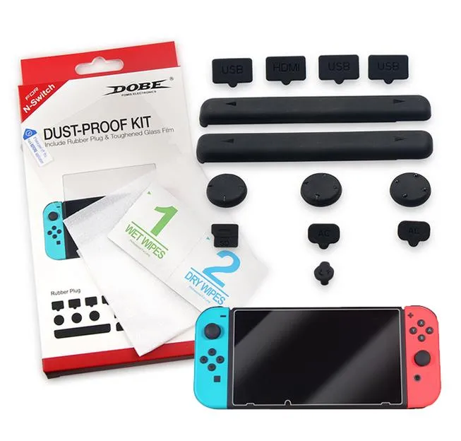 Специально созданные для Nintendo Switch, пылевые заглушки, помогут предотвратить попадания пыли во всевозможные углубления и разъемы игровой системы, а защитное стекло защитит экран от царапин.