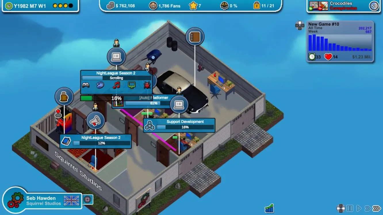 - Развивайте свою студию от скромных начал в гараже до аренды роскошных офисов в небоскребах, оснащенных серверными фермами для поддержки ваших амбициозных MMO проектов.