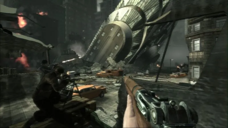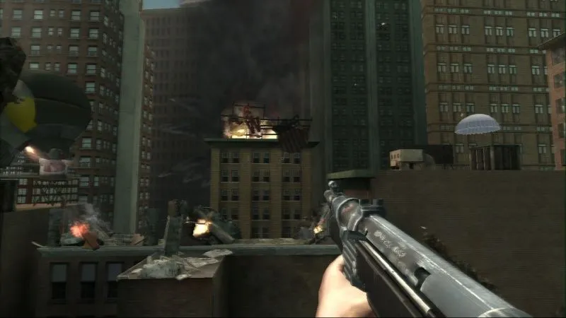 Немецкие линкоры у побережья Нью-Йорка, проплывающие над статуей Свободы гигантские десантные дирижабли, поливающие улицы Манхэттена огнем "Мессершмиты" ... Это безумие? Это альтернативная история от Turning Point: Fall of Liberty, бескомпромиссного first-person shooter от создателей Call of Duty: Finest Hour.