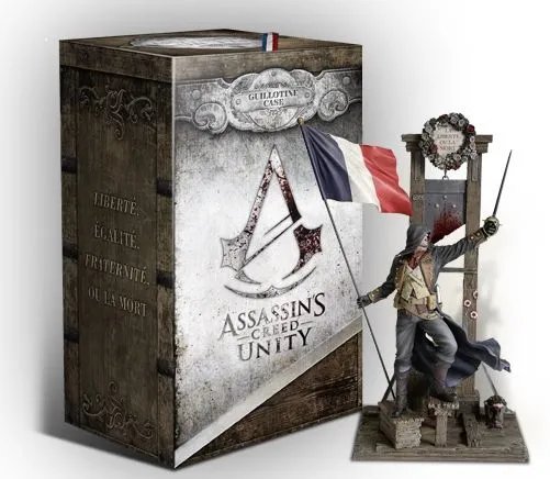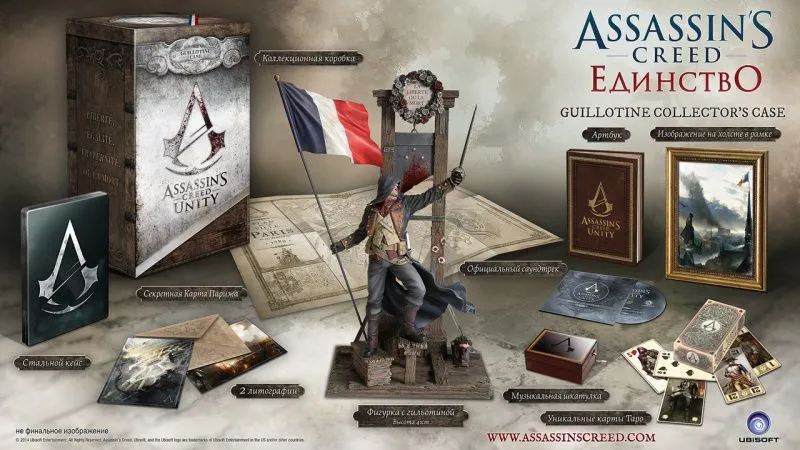 В эксклюзивном издании ASSASSIN’S CREED ЕДИНСТВО «ГИЛЬОТИНА» фанаты серии найдут множество сокровищ: фигурку Арно на гильотине, красочный альбом концепт-арта, официальный саундтрек к игре, эксклюзивную коллекционную коробку, секретную карту Парижа, колоду карт Таро, изображение в рамке, выполненное на холсте, и деревянную музыкальную шкатулку, играющую тему, столь полюбившуюся всем поклонникам серии Assassin’s Creed. Также вы получите доступ к двум заданиями для одиночной игры – это дополнительные 45 минут игрового времени – и к новым предметам для одиночной игры, включая оружие и костюмы!
