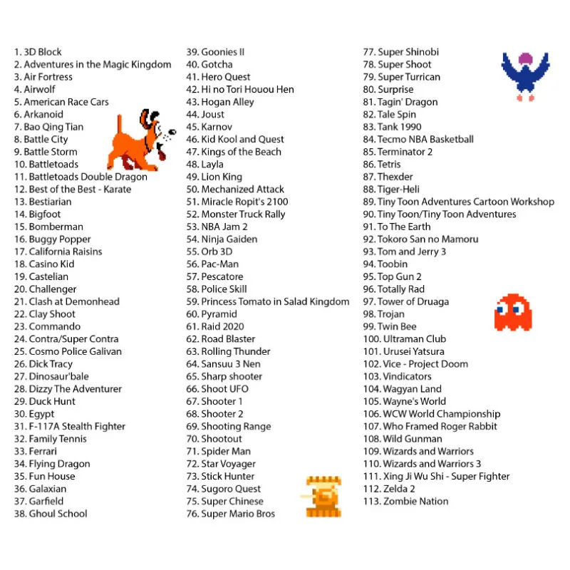 Этот картридж представляет собой впечатляющую коллекцию из 113 игр, охватывающую широкий спектр жанров и предназначенную для игроков всех возрастов. Это настоящий кладезь развлечений, гарантирующий часы увлекательной игры!