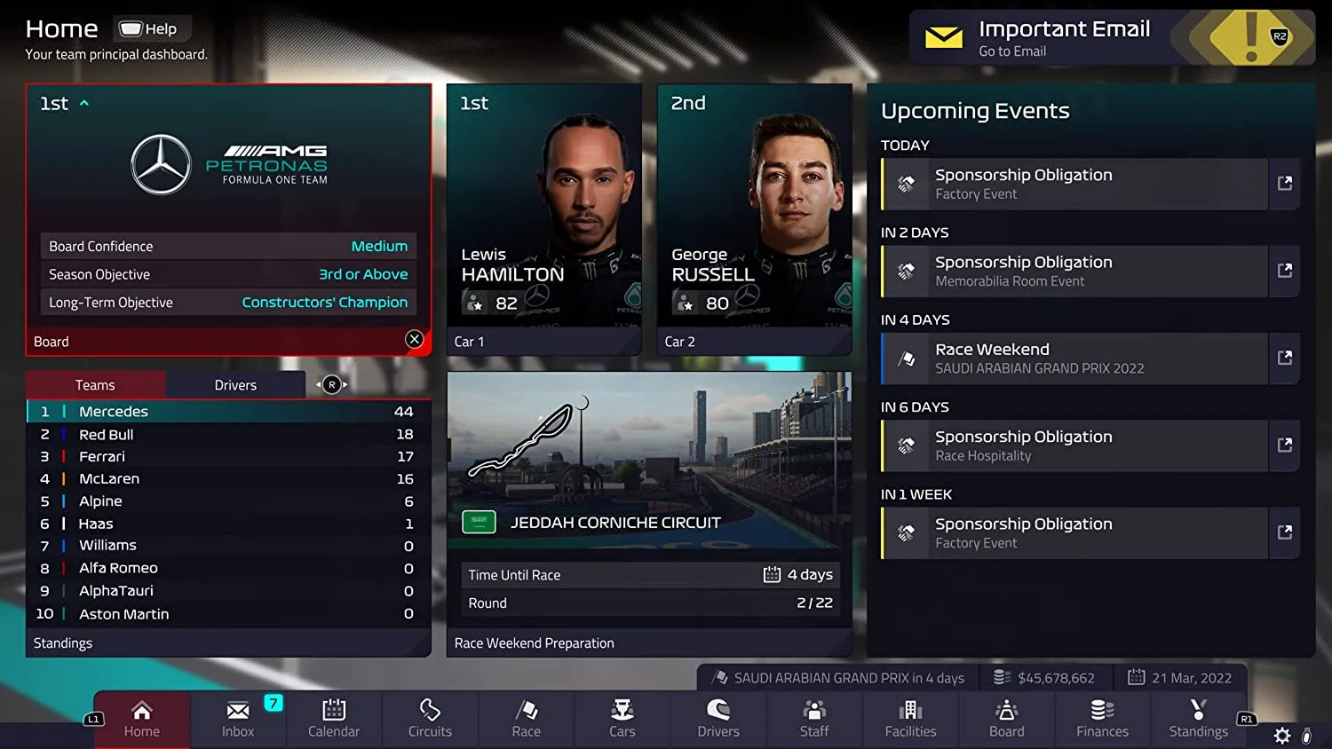 Конструкторский штаб — это двигатель всех гоночных процессов. Он нацелен на поддержание команды вне гонок. Следите за показателями своих лучших пилотов и стюардов, контролируйте бюджет команды и выхватывайте преимущество в предстоящих гонках, переманивая персонал соперников на свою сторону.