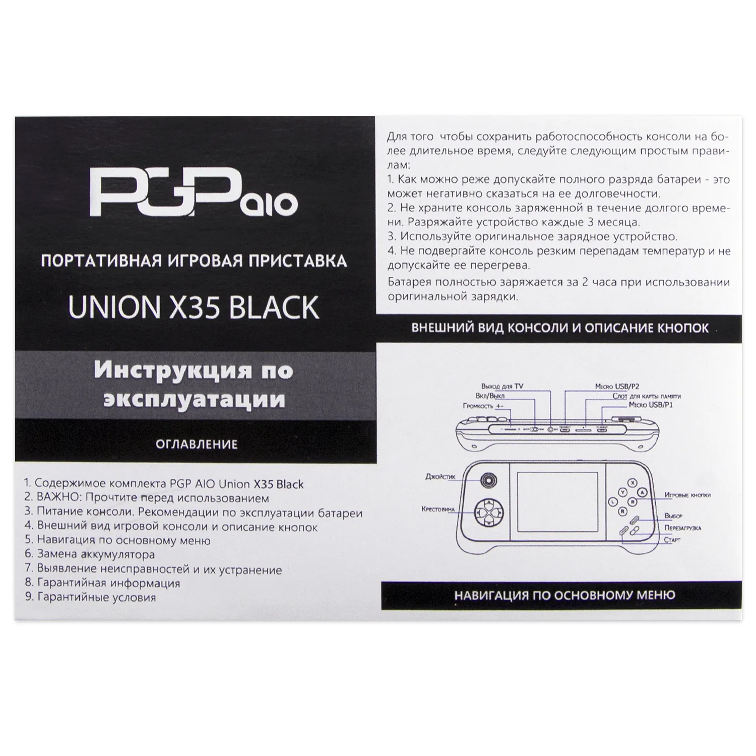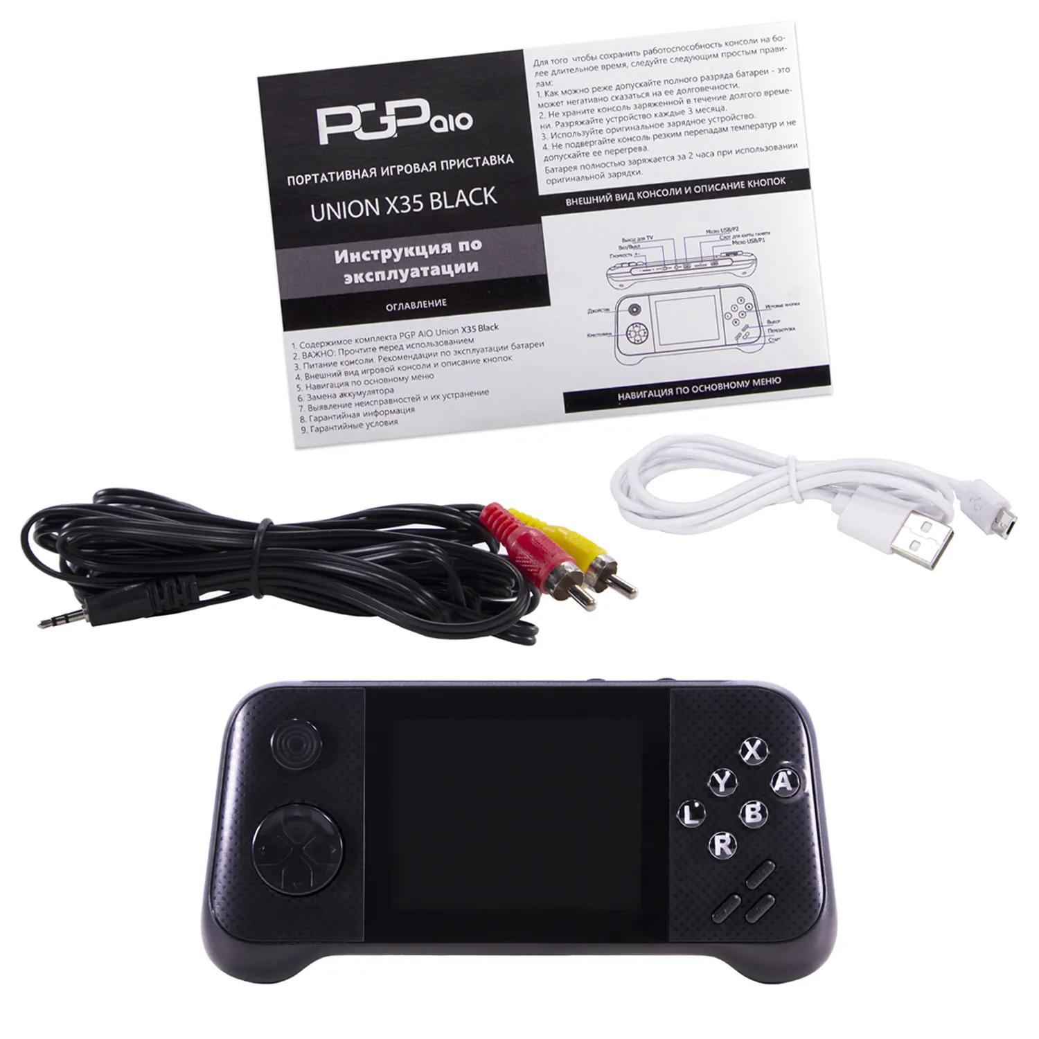 Комплектация включает в себя игровую приставку Union X35 Black, кабель Micro USB для зарядки и подключения к компьютеру, перезаряжаемую аккумуляторную батарею для продолжительной игры и инструкцию по эксплуатации, чтобы вы могли быстро начать играть.