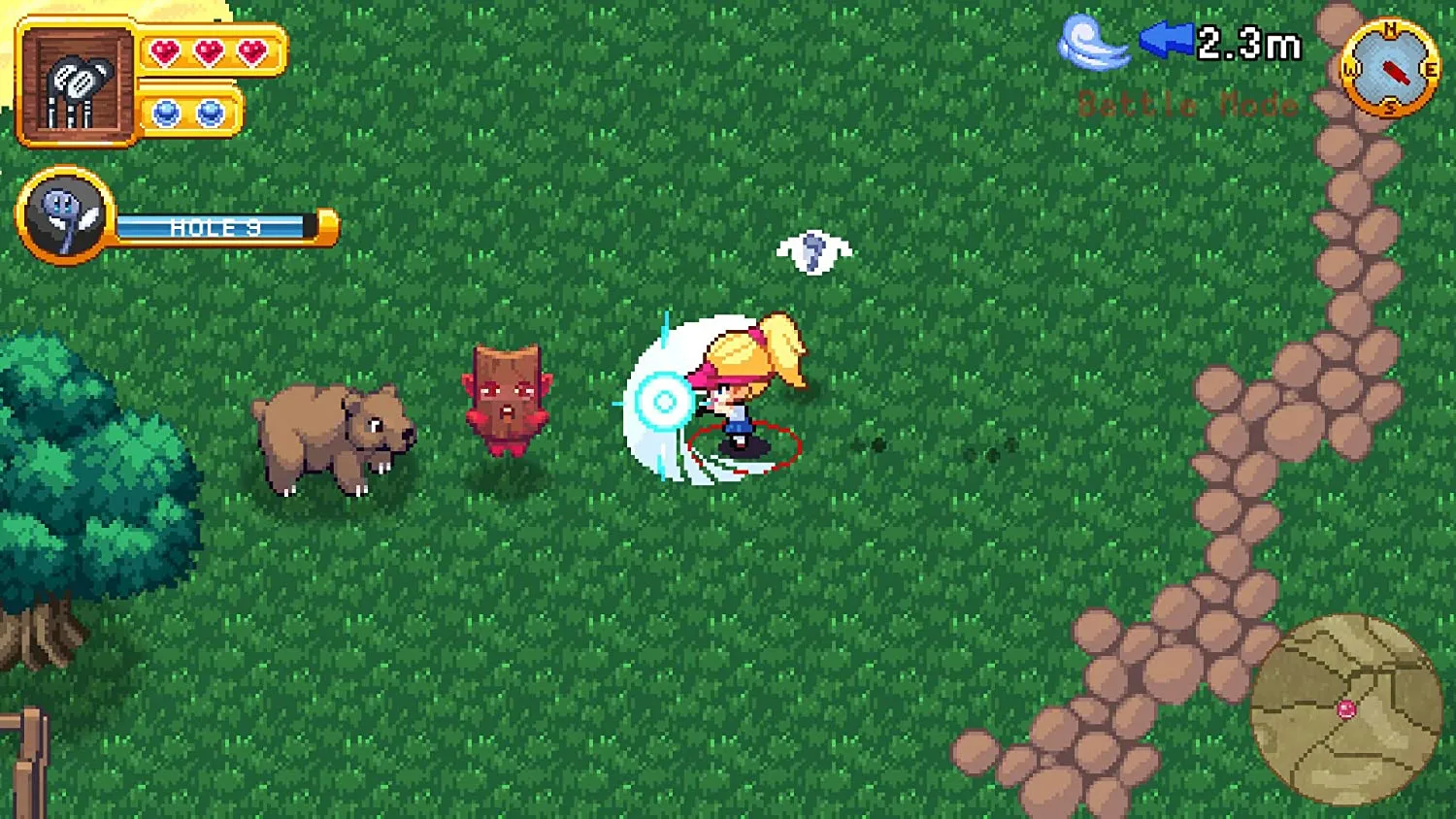 И вот однажды появилась храбрая девушка, решившая сыграть на самом прекрасном поле в мире. Вооруженная только своей клюшкой для гольфа, она отправлялась играть на девять легендарных лунок. Но сначала ей нужно будет избавить землю от монстров...