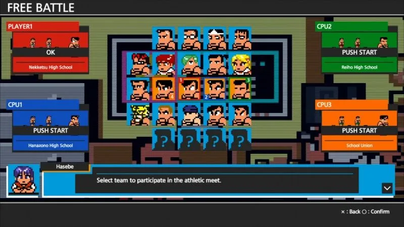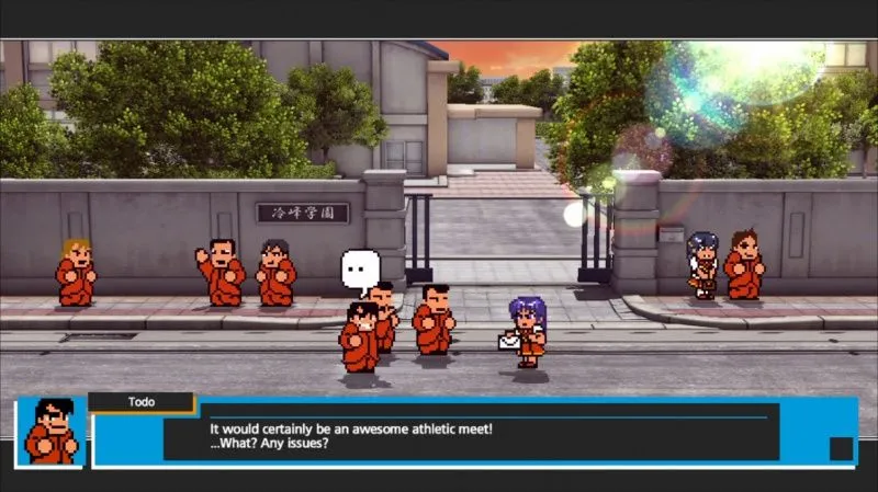 Внешкольные соревнования в Речном Городе стали экстремальными! Хулиганы со всех средних школ собрались, чтобы побороться с таинственным Конгломератом Тобиока в Супер Спортивном Соревновании. Без рукоприкладства не обойдётся. Правда под Спортивным Соревновании японцы понимают бег и смертельные драки со всем что возможно. В арсенал входит все, от фейковый катаны самурая, штанги и гири до булыжников, кастета, волщебной палочки, адреналина в бутыле и даже жезла Сейлор Мун . Можно быть первым в быстром беге, а можно просто поубивать всех конкурентов и в гордом одиночестве пересечь финишную линию. После чего борьба за колокол в японской манере и драаааааааааааааааааака на крыше школы. Игра основана на популярной серии приключений Кунио, в которые входят игры «River City Ransom», «Super Dodge Ball Brawlers» и «River City Soccer Hooligans». Сражайся до победы: одолей всех жесткой гонке между школами Речного Города. У вас на выбор шесть школьных команд, каждая с шестью уникальными персонажами, владеющими разнообразными приёмами, вроде Человек Бомба, Выстрел Пиццей, и Стальной Удар!