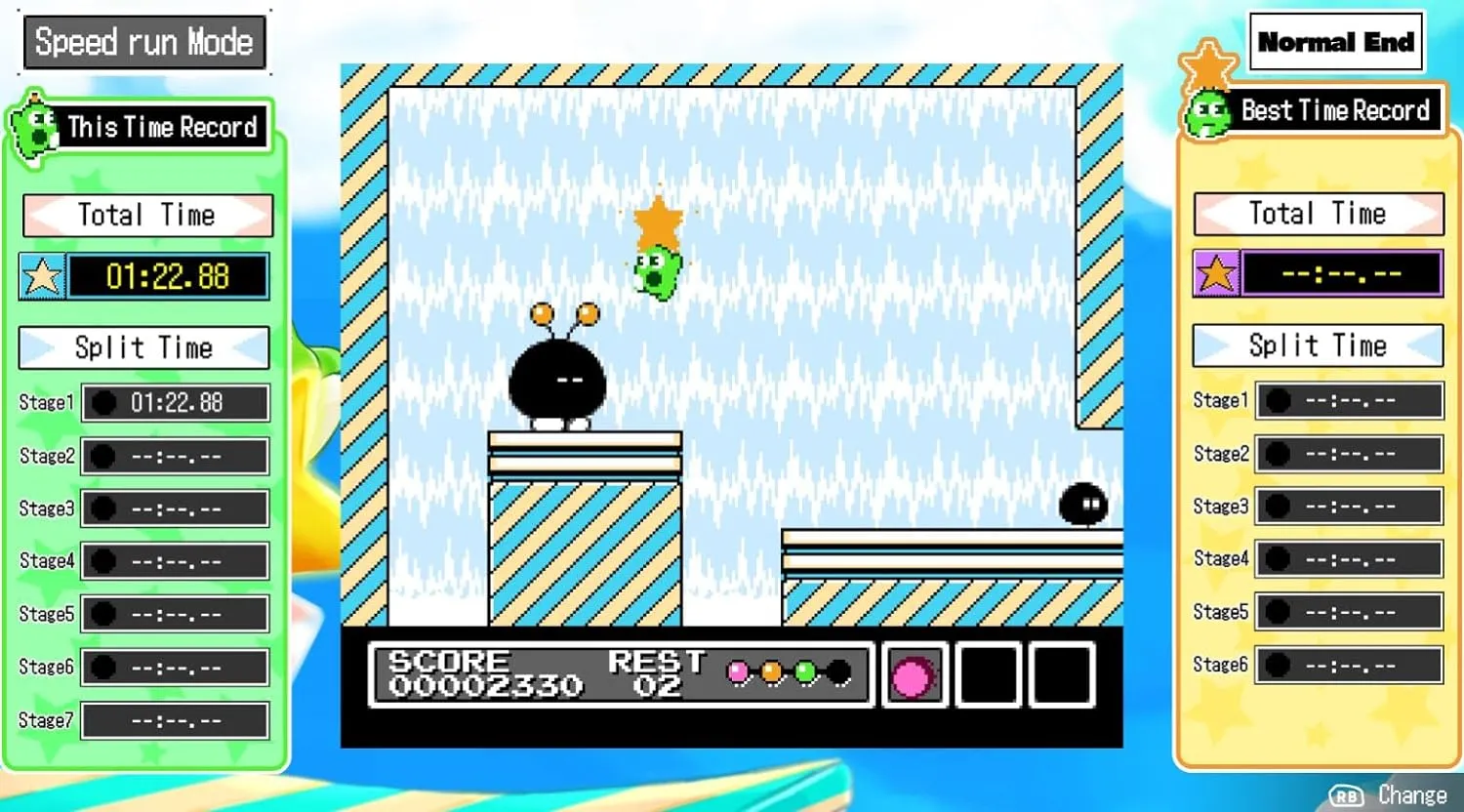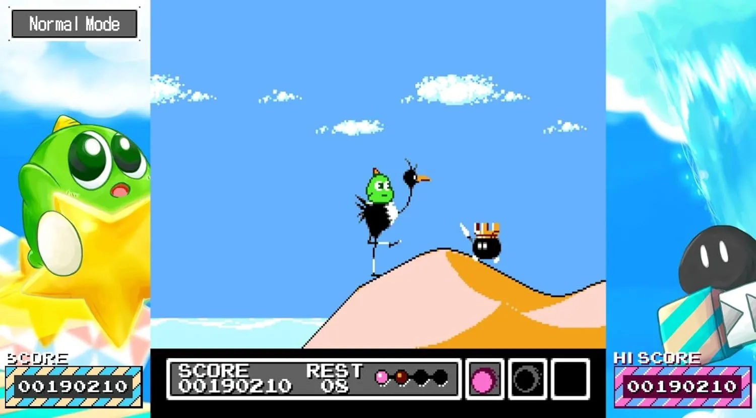 Специальное издание Gimmick! Special Edition предлагает режим скоростного прохождения для тех, кто стремится покорять вершины и делиться своими успехами в стримах. Искатели тайн смогут исследовать каждый уголок игры в поисках скрытых секретов, и те, кто сможет их разгадать, будут вознаграждены неожиданным сюрпризом! Если же вы ищете истинный вызов, попробуйте «Серьезный режим», отключив все дополнительные функции и наслаждайтесь игрой в её первозданном виде.
