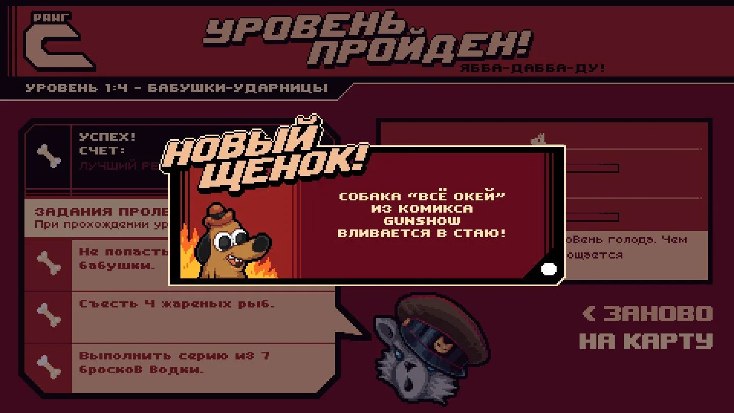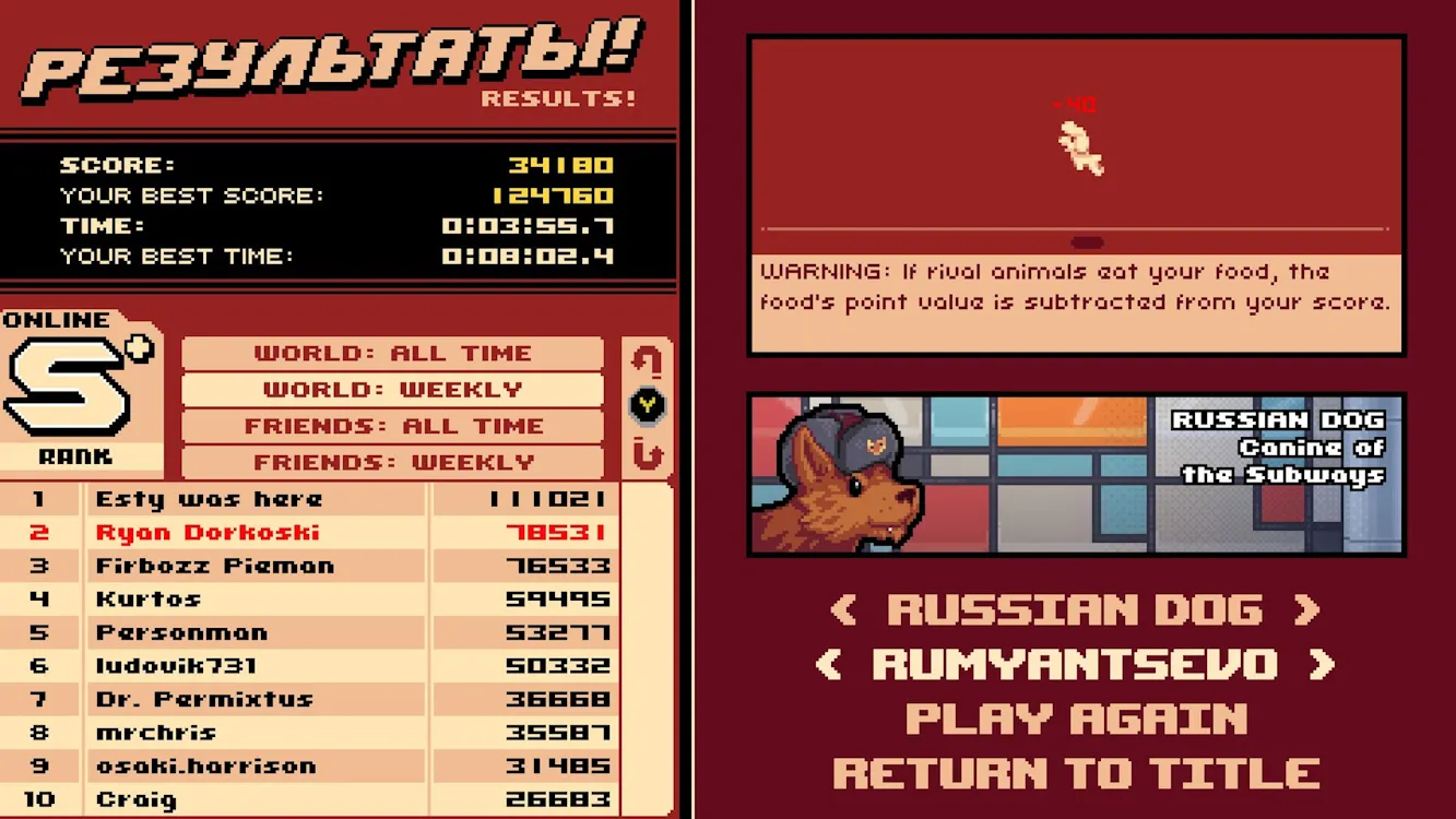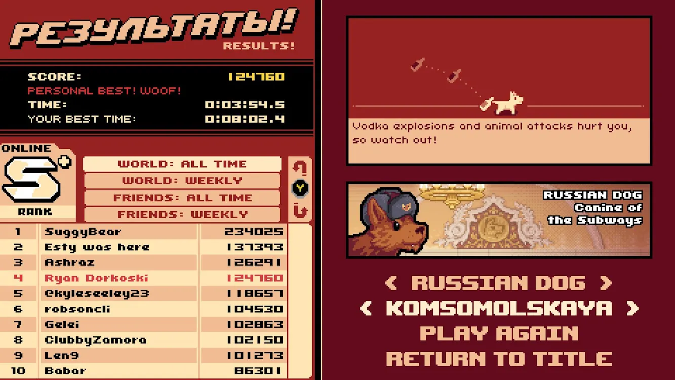 Здравствуйте, товарищи! Представляю вам Russian Subway Dogs! Мы провели широкомасштабное и абсолютно законное исследование с целью как можно точнее отразить в этом хаотичном аркадном симуляторе, насколько сложно красть еду у пассажиров московского метрополитена. Как тут выживешь, если надо уклоняться от взрывоопасной водки, собак-конкурентов, а также от редкого и очень опасного медведя из подземки!
