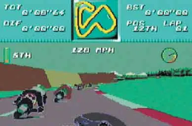 Можно поиграть на пару со своим приятелем (при этом экран делится пополам по горизонтали) и / или повысить уровень сложности. Этих уровней всего четыре. Думаете, чем выше сложность, тем больше у вас отнимут благ? Не-а! Вам, наоборот, их дадут! Главным благом будет скорость. Чем выше сложность, тем больше будет скорость вашего мотоцикла (но и соперников то-же) и тем сложнее управлять мотоциклом. А скорости не маленькие, от 156 на Easy до 205 на Professional. Отсюда и все проблемы. Если же и этого окажется мало, то существует Turbo-режим. Это когда все становится маленьким, а скорость перемещения возрастает до предела. Так что насладитесь вдоволь.